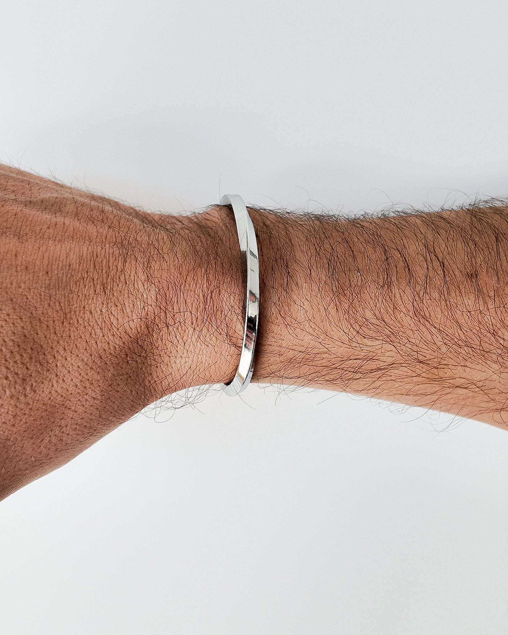Ce jonc en acier inoxydable est poli pour une brillance subtile mais masculine.
