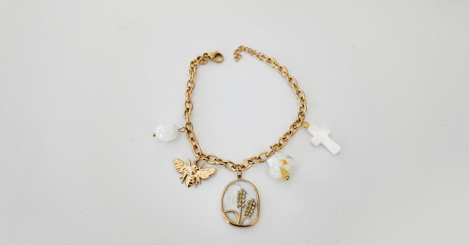 Détails Breloques (croix perlée, fleur, perles, abeille)