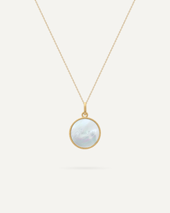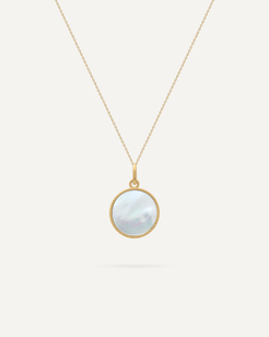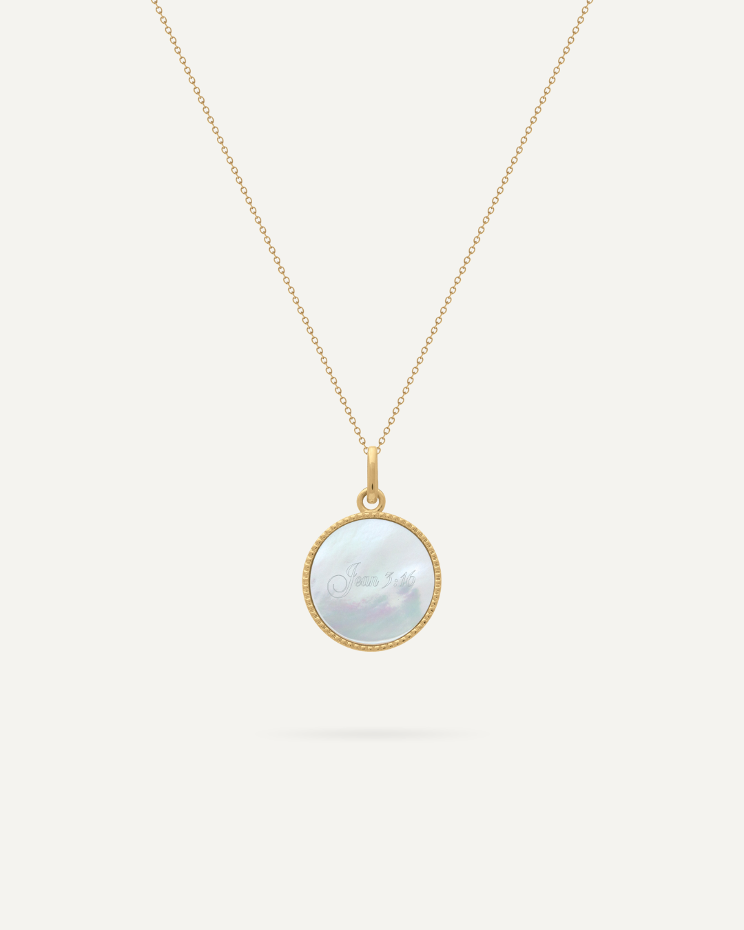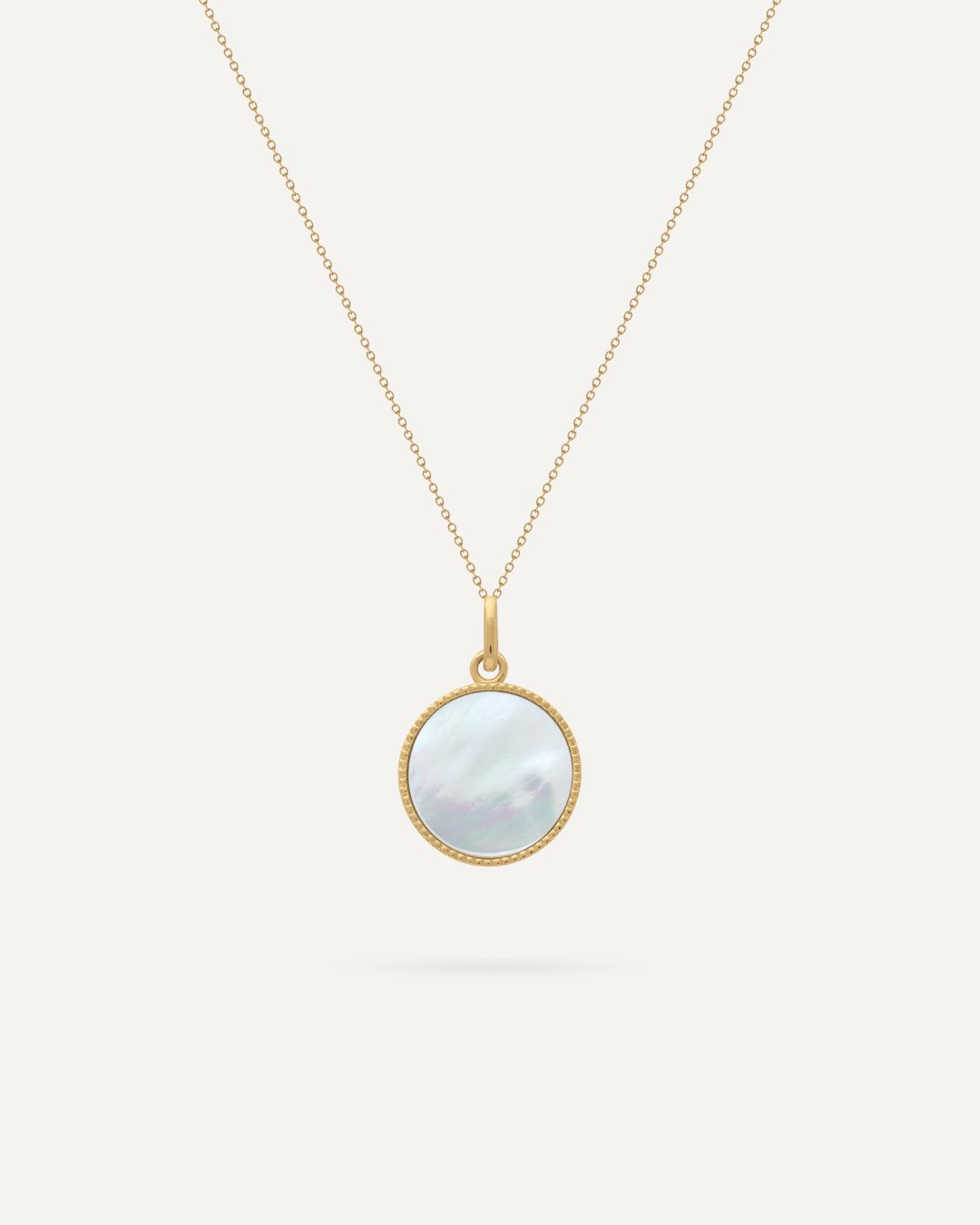 Cette médaille ronde en nacre, sertie clos, offre une présence douce et lumineuse,